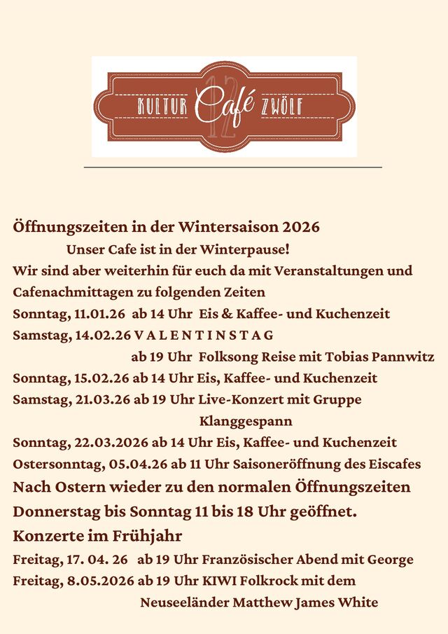 Nach seinem ausverkauften Konzert im Frühjahr des Jahres kommt der kanadische Sänger und Songschreiber Paul O Brien mit keltischen Einschlag erneut ins kleine Café Zwölf.  Mit seiner ausdrucksstarken, warmen Stimme verzaubert der charismatische Sänger seine Zuhörer am Freitag, den 31.10. 2025 ab 19 Uhr. Begrenzte Sitzplätze, daher bei Heike rechtzeitig Karten reservieren.